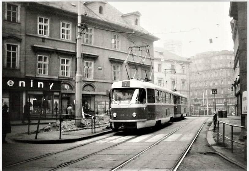 Historická fotografie. Po Jungmannově náměstí drnčela tramvaj