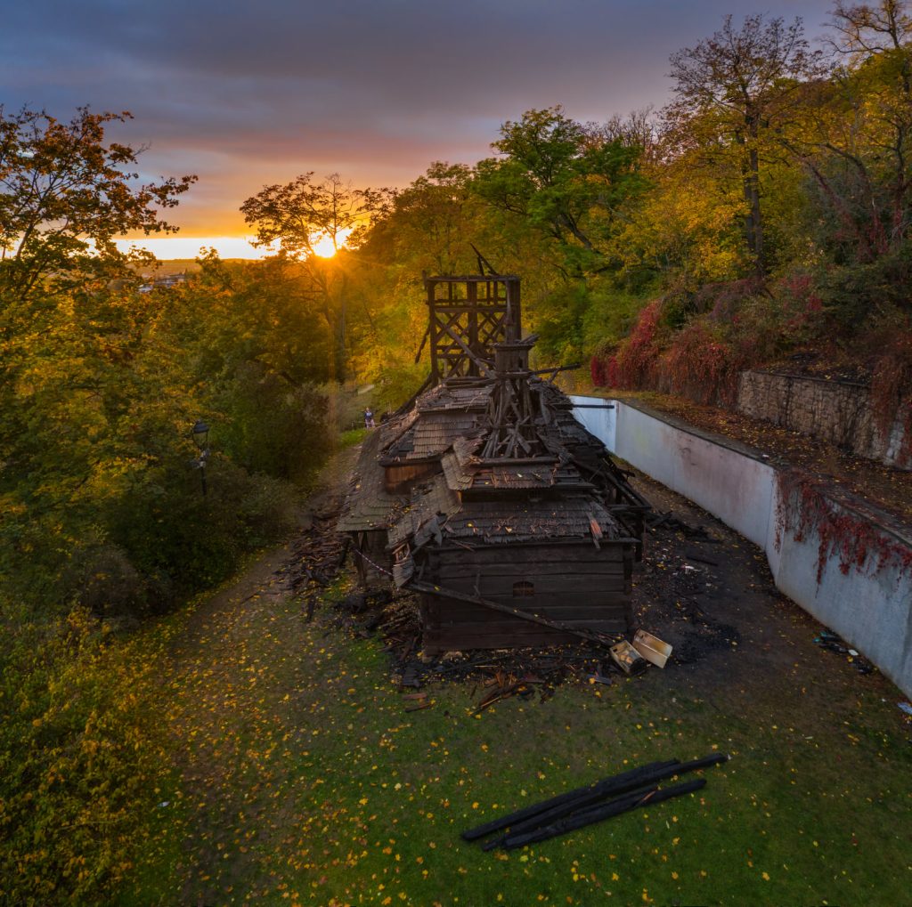 Dřevěný kostel sv. Michala v zahradě Kinských po požáru