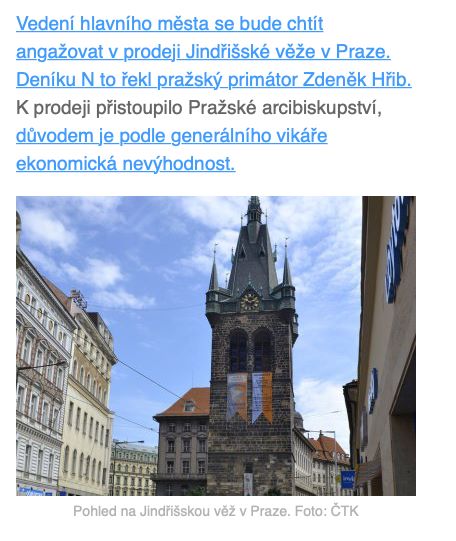 Jindřišská věž je na prodej! Zněly titulky médií. To vzbudilo u lidí vlnu nevole. Obávají se, že památku zapsanou na seznamu UNESCO koupí firma, která by věž mohla upravit k obrazu svému. Mohlo by hrozit, že ji pro veřejnost uzavře úplně a nechá ji jen pro speciální akce, třeba pro firemní večírky. Magistrát se proto rozhodl s arcibiskupstvím v Praze, které památku vlastní, jednat. Bez úspěchu. Cenu 75 milionů pro Prahu nesníží. „Musíme se chovat ekonomicky,“ řekl generální vikář pražské arcidiecéze Jan Balík. Město chce s církví ještě jednat. Do konce roku by měla mít analýzu, která ji řekne, jestli má smysl slavnou věž kupovat.
