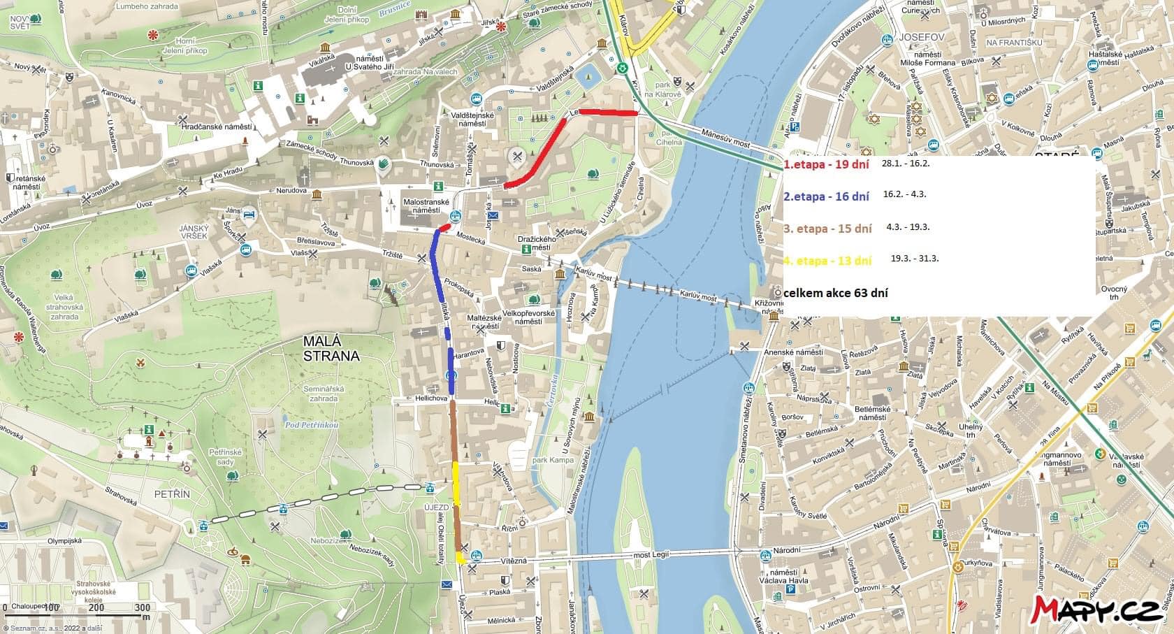 Výměna proběhne celkem ve čtyřech etapách. Od 28. ledna do 16. února budou vyměňovány koleje od Klárova na Malostranské náměstí, od 16. února do 4. března v úseku Malostranské náměstí – Hellichova a poté budou na řadě dvě závěrečné etapy od 4. do 31. března, během kterých budou postupně vyměněny koleje od Hellichovy ulice po Vítěznou.