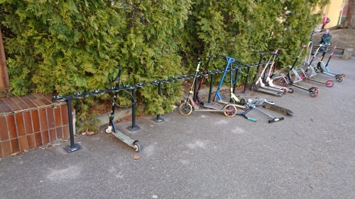 Koloběžka je ve městě fajn dopravní prostředek. Je lehká a skladná. Je dostupná a nemusíte se tolik bát, že se stane terčem zlodějů. Mezi školními dětmi je to docela oblíbený dopravní prostředek do školy, ale učitelé, ředitelé a školníci už to tak rádi nevidí. Koloběžky v šatnách překáží, do skříněk se nevejdou a navíc se s nimi do budovy nosí bahno. Není proto výjimkou, že se koloběžky ve školách zakáží. Proto projekt Pěšky městem v rámci projektu Bezpečné cesty do školy tlačí na město, aby pro děti začalo instalovat speciální koloběžkové stojany u škol. Běžné jsou třeba ve Vídni. Píše projekt ve svém článku Stojany na kola a koloběžky pro školy.