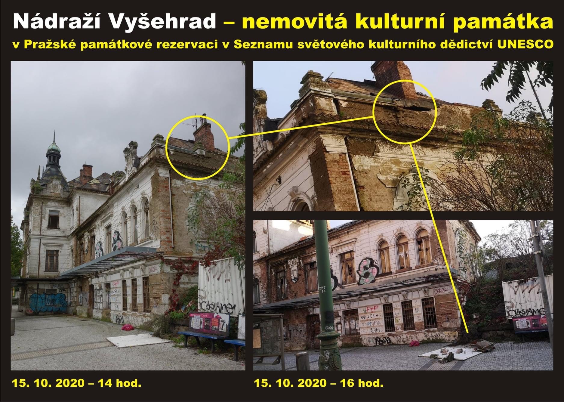 Kulturní památka dostala další ránu. Na střeše nádraží Vyšehrad se objevila díra a kvůli dešťům do ní začalo zatékat. Na situaci upozorňuje aktivista z Prahy 2, který stojí také za iniciativou Za Folimanku, Tomáš Čada. Ten psal o tom, že informoval odbor památkové péče. Magistrátní památkáři (MHMP OPP) mu napsali, že věc řeší se stavebním úřadem Prahy 2. „MHMP OPP s minulým vlastníkem opakovaně vedl správní řízení ve věci nápravy. Nyní je budova ve vlastnictví nového subjektu. MHMP OPP upozornil nového vlastníka na práce, které je nutné bezodkladně provést k zabezpečení stavby, a to včetně řešení stavu Vámi zmiňovaného nedostatečného zajištění střechy. Stav budovy MHMP OPP v součinnosti s příslušným stavebním úřadem řeší,“ napsali památkáři.