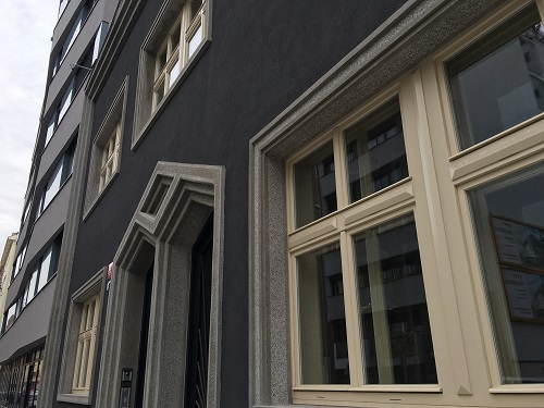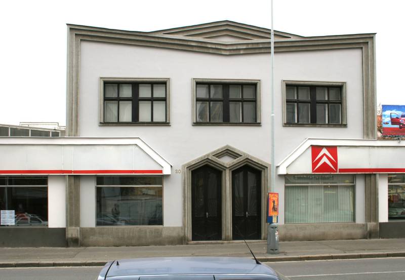 Stockar tehdy na administrativní budově v Holešovicích využil populárních motivů čtyřa šestibokých krystalů, základních kubistických prvků. Unikátní podívaná se nachází uvnitř. Ten, kdo vstoupí jako by se ocitl v krystalické mřížce bronzového prášku. Kubistický dekor použil Stockar u stropního světla na chodbě, na kyvných dveřích i u dřevěných podhledových obkladů na stěnách.