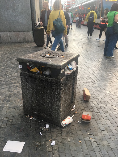 Všímáte si kolik odpadků se ve městě válí? Stačí jít do práce a lépe se dívat. Velký problém je třeba u obyčejných košů, třeba u zastávek. Většina z nich je zaplněna už dopoledne. Problém je ale složitější. Jedná se třeba o tvar takových košů. Třeba u Anděla stojí čtvercové s malými otvory. Tenhle kousek aspiruje v naší soutěži o „nejhnusnější a nejblbější koš v Praze“. A mimochodem, všimněte si, kolik různých druhů košů v Praze máme. Jasně, že musí padnout otázka – a kde je to plánované sjednocení městského mobiliáře? Problém je taky mířen na lidi, kteří nemají problém takový nepořádek udělat. Rada? Žádejte svoje radnice, ať zařídí častější svoz odpadků.