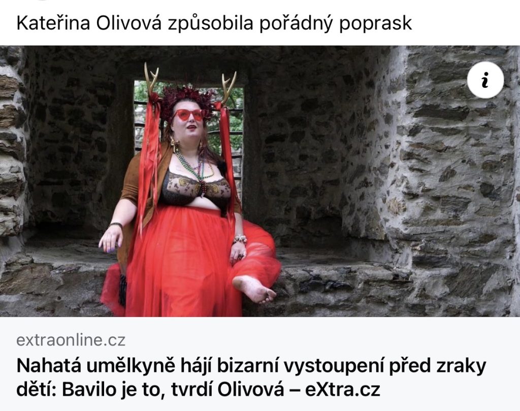 Sociální sítě v úterý obletělo video, na kterém nahá umělkyně Kateřina Olivová za zvuků techna rozhazuje hlínu, zatímco ji pozorují přítomné děti. Vystoupení, které se odehrálo 30. dubna v areálu Akademie výtvarných umění (AVU), prošetřuje policie. Děti měly být přítomny se svými rodiči, uvedla PR specialistka AVU Petra Švecová.