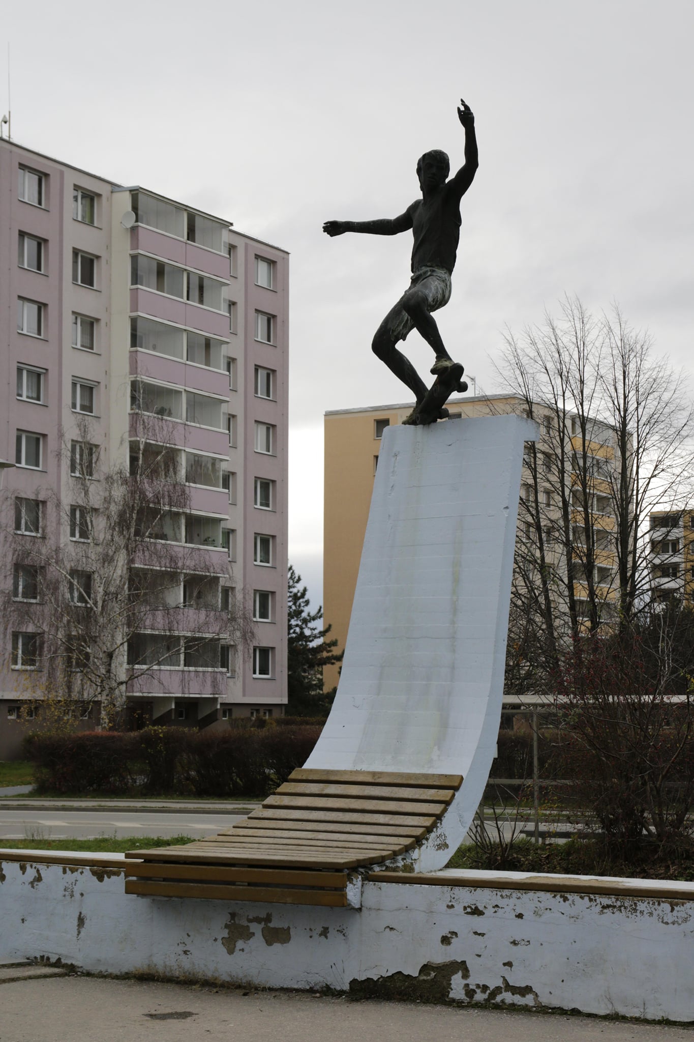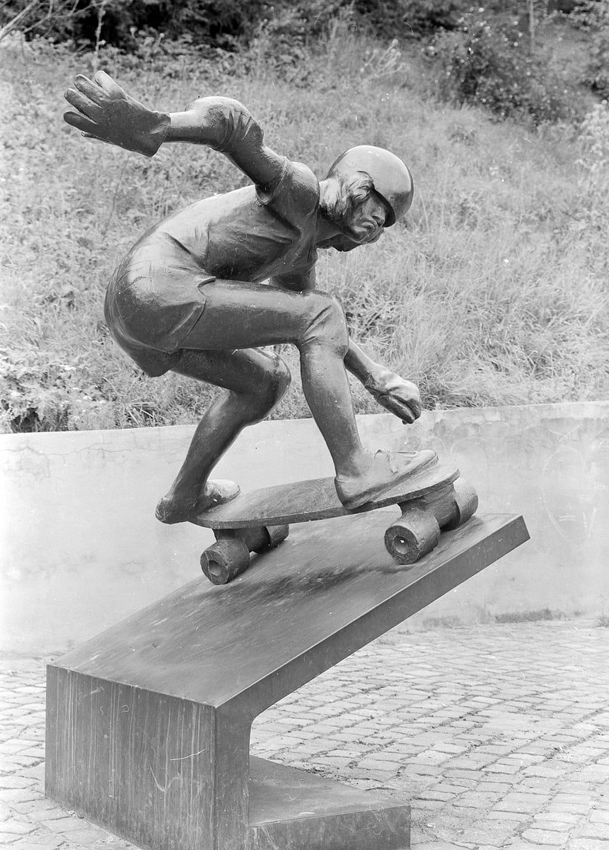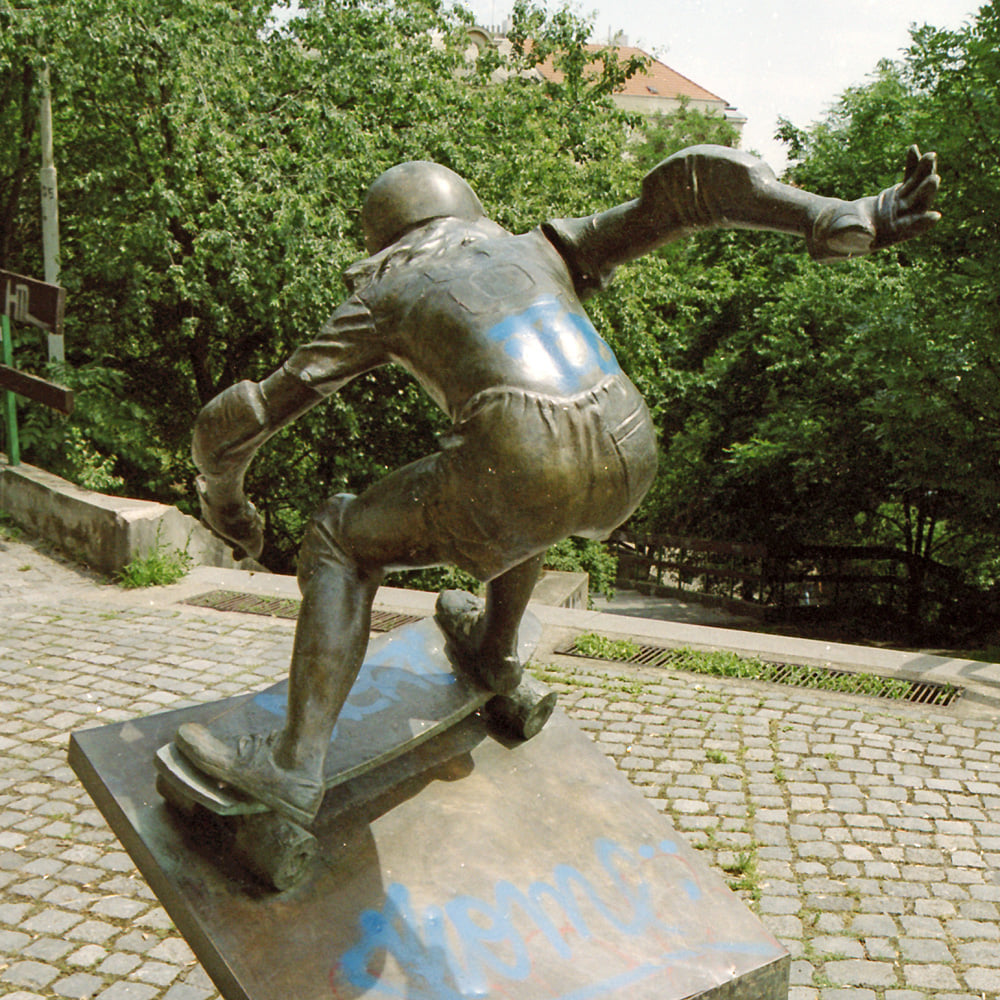 První skateboardingová socha stávala v parku Folimanka nedaleko Nuselského mostu. Byla odstraněna v roce 2006, protože byla terčem útoků vandalů. Bronzovému skejťákovi někdo odřízl ruce, v jeho helmě se našly stříkačky narkomanů, na byly tam i stopy po kulkách. To je svědectví divokých nuselských devadesátek.