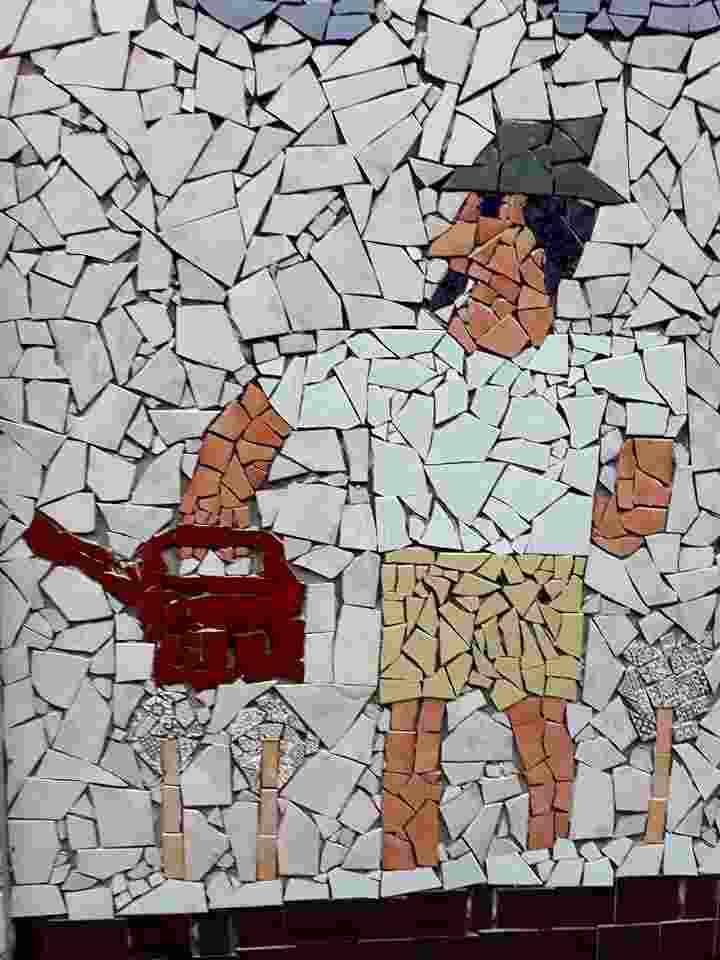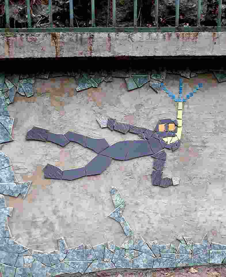 V ulici Pod Andělkou v Praze 6 na šeredné zdi někdo (neví se kdo) vytváří mozaiky ze starých kachliček. Sice je to ilegál iniciativa, ale nám se to líbí. Stejně jako kdysi v pražských ulicích načerno prováděná “guerilla gardening”.