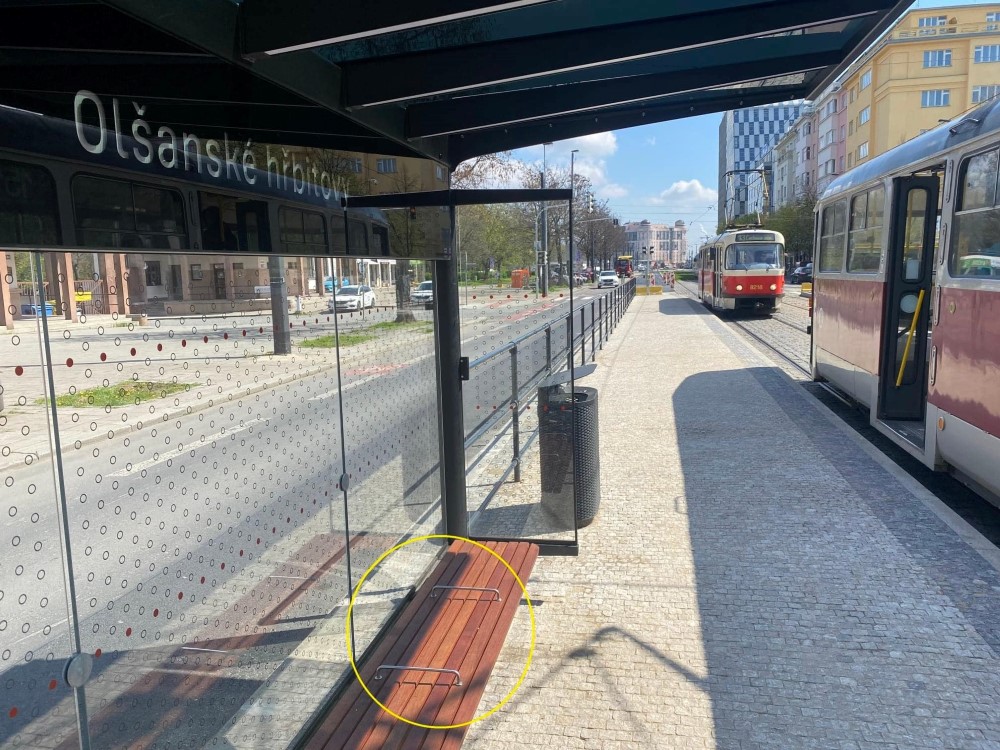 Na vinohradské zastávce se objevily takzvané separátory. Údajně mají sloužit k tomu, aby se bezdomovci v těchto přístřešcích nezdržovali. Tak…