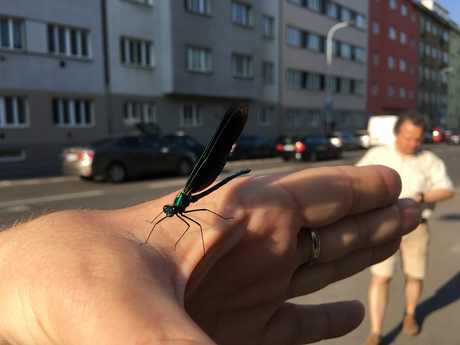Šli jsme po ošklivé, špinavé, hlučné, dopravou zatížené ulici Vrchlického na Smíchově a připojila se k nám tahle vážka, přesněji…