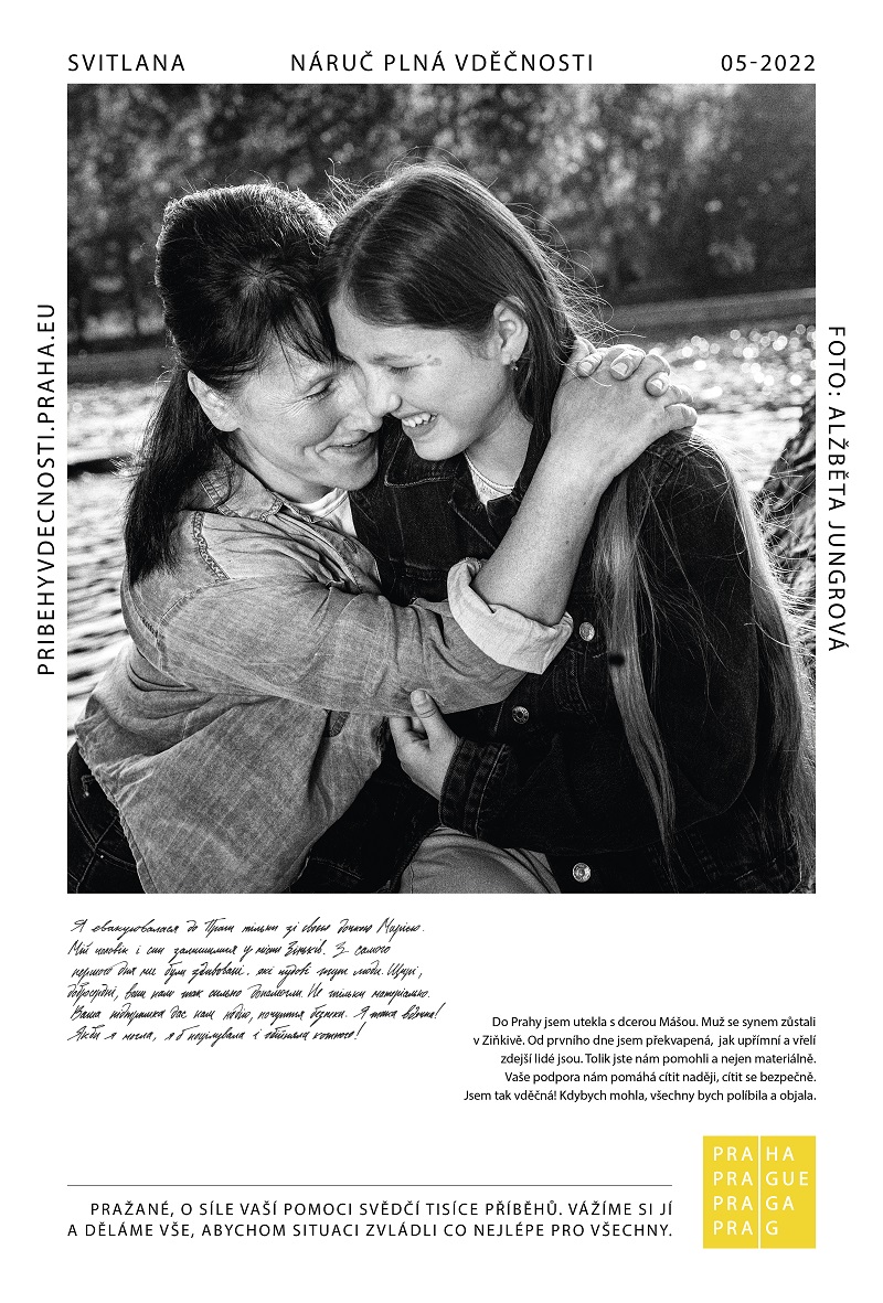 Šestice portrétů pojmenovaná jako Příběhy vděčnosti zachycuje ukrajinské uprchlíky i Pražany, kteří se rozhodli pomoci. Prostřednictvím jejich osobních výpovědí chce hlavní město přinést pohled na aktuální situaci skrze jednotlivé lidské osudy. Autorkou fotografií je uznávaná reportážní fotografka Alžběta Jungrová, několikrát oceněná v soutěži Czech Press Photo.