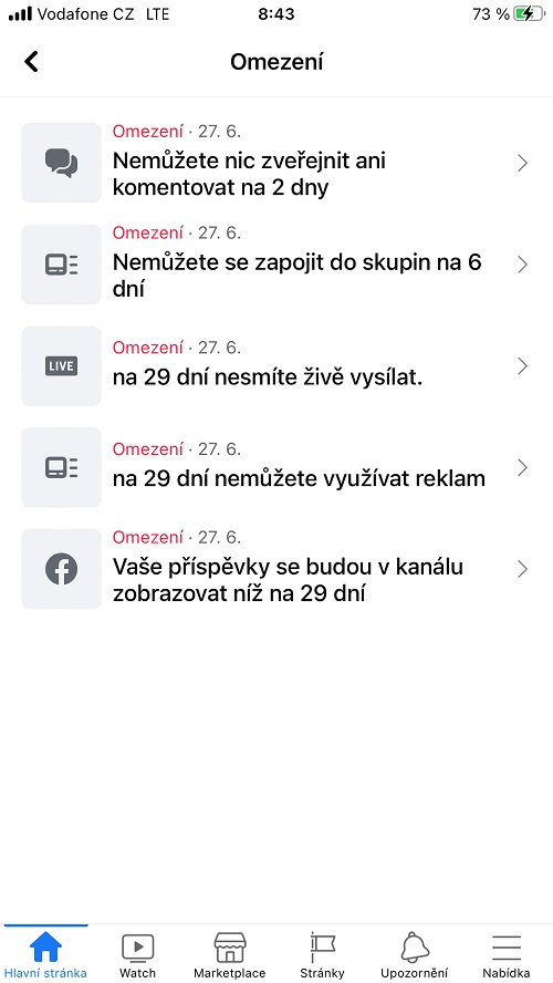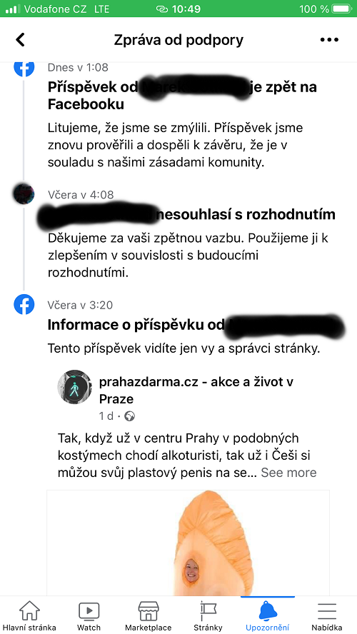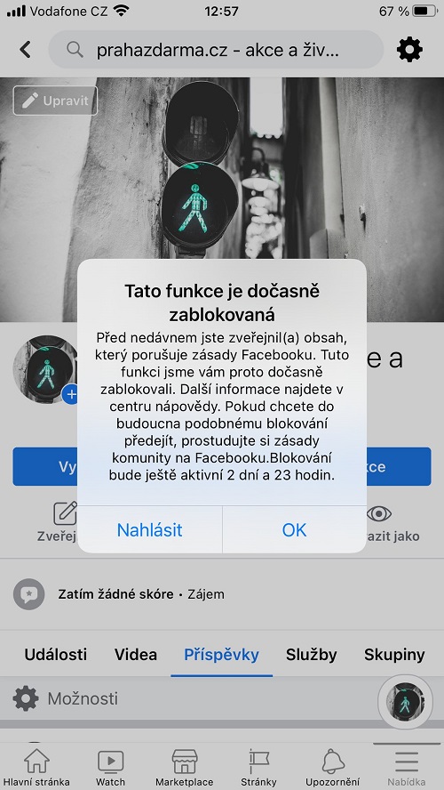 Den na to nám Facebook kompletně zablokoval přístup. Považoval nás za „nebezpečnou organizaci“. Víme, že blokaci udílejí roboti, ale také zaměstnanci na centrálách, kteří poznají podle fotek cokoli nepatřičného. Pokusili jsme se o odvolání proti takovému rozhodnutí. Napsali jsme „jim“, že kluci (asi z Asie) nepochopili náš text. Nebyl nijak proti zásadám slušného chování a že nejsme „nebezpečná organizace“, jak by se hlídačům zdálo. O to víc je takové rozhodnutí nefér s faktem, že šiřitele hoaxů nepovažují za nijak závadové. Centrála se nám ten den omluvila a pustila nás zase do „svého světa“.
