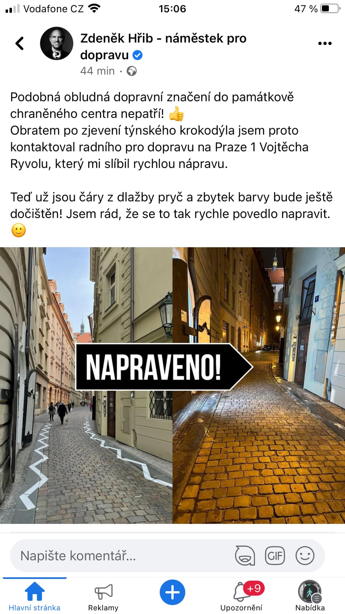 Po kritice značení nechal magistrát smazat, respektive se tím pochlubil náměstek pro dopravu Zdeněk Hřib. Jenže to ještě nevěděl, že radní pro dopravu Prahy 1 Vojtěch Ryvola chce krokodýlí klikyháky vrátit. Smazat je museli jen kvůli tomu, že je únor a počasí nesvědčí barvě, která se od dlažby oloupla. Čáry tu tedy vydržely jen pár hodin. Takže to máme další zářez mezi nápady v centru Kocourkova. Kocourek smázl týnského krokodýla. Zatím.