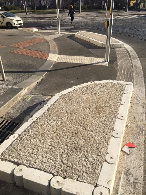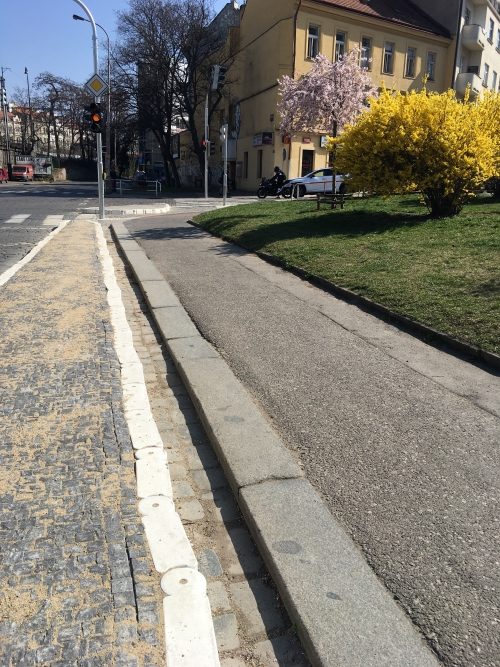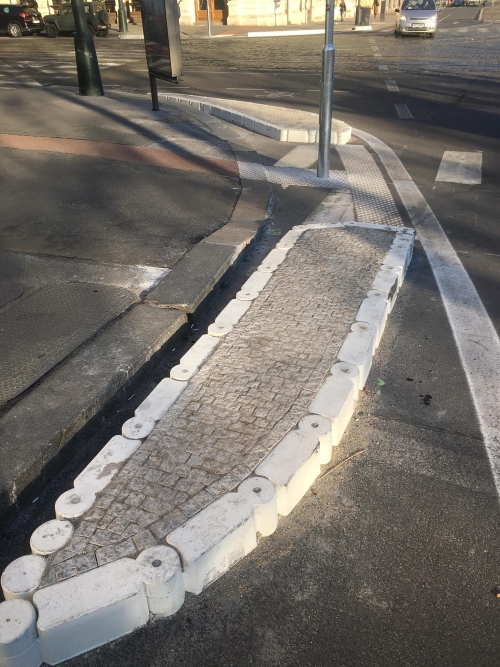 - Pokud ten pruh podél chodníku je cyklostezka, tak bych to tipoval na obdobu toho, je na železnici tzv. „přídržnice“. Cyklista by měl najet do drážky mezi chodníkem a ostrůvkem a to by mělo zajistit, aby v zatáčce nevypadl ze svého pruhu mezi auta.