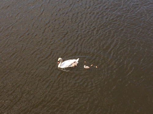 Všechny obavy nakonec zažehnal dnešní pohled na Vltavu. Labutí samičku na Vltavě pronásledovalo sice jedno mládě, ale další čtyři se vezla pod křídlem. To je dobrá zpráva! Tak doufáme, že na dobré zprávě nic nezmění ani otevření baru Čapadlo. Prosíme! Nekrmte je pečivem! Je jedno v jakém stavu je. Podle ornitologů totiž mláďatům hrozí nedostatek živin, které potřebují ke správnému vývinu. Z takových ptáků mohou vyrůst nelétající mrzáci. Psali jsme například v článku Labuť bez křídla. Nekrmte je rohlíky! O nevhodném jednání některých lidí jsme psali také v článku Dodávka přijela a vysypala k labutím několik popelnic s pečivem. Raději jim přineste odřezky zeleniny, třeba listy květáku nebo zbytky hlávkového nebo ledového salátu. Díky!