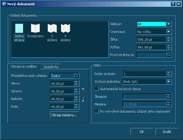 Rozměry stránky po odečtení okrajů nám daly sazební obrazec. Aby byla práce pohodlná, zvolte vnitřní okraj 13 mm, vnější okraj 14 mm, horní a dolní 15 mm. Tím se šířka dostane na 270 mm, což je číslo dělitelné pěti i šesti, bude se tedy pohodlně vytvářet pěti- i šestisloupcová sazba. Obdobně výška vyjde na 390 mm, což je taky fajn. Okno by mělo vypadat takto: