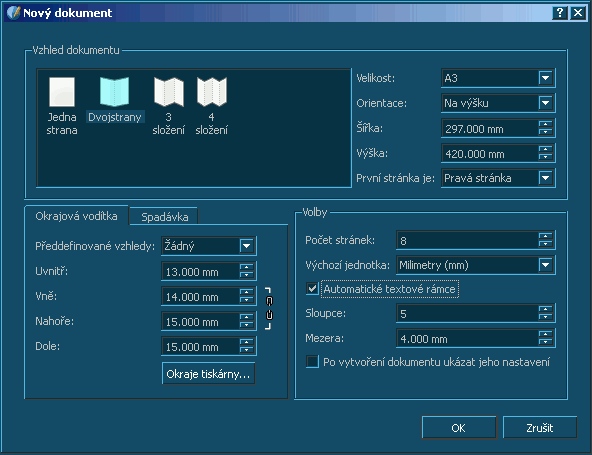 Dále musíte věnovat pozornost okrajům. Aby se noviny dobře četly, zvolte minimálně 13 mm, přičemž nahoře a dole můžete dát víc. Tiskárna umožňuje tisknout i „přes hřbet“, čehož lze využít na prostřední dvoustraně novin, která je vidět vcelku, kde můžeme tisknout tzv. panorama, čili jeden sazební obrazec přes obě stránky. Na jiných dvoustranách to jde teoreticky také, ale nedělejte to.
