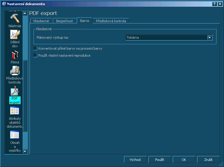 Poslední věc, kterou musíte udělat, než začnete sázet, je nastavení výstupu. Dá se to udělat i později, ale pak na to pravděpodobně zapomenete a tiskárna vám PDFko vrátí, že je netisknutelné. Ztratíte možná hodinu, možná den. Vyplatí se to teď hned! Přes menu Soubor > Nastavení dokumentu najdeme záložku PDF export. Ta má 4 karty, z nichž jedna je Barva. Tam nastavte výstup na Tiskárna. To zajistí, že písmo bude opravdu černé v barvách CMYK.