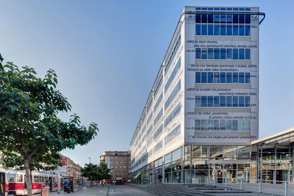 Během dne, jak se mění světlo, tak i tato stavba lehce a nenápadně mění na své fasádě svou barvu. Na ní jsou úryvky z děl Kafky, Rilkeho či Ortena. Dominanta Smíchova, kterou navrhl francouzský architekt Jean Nouvel má skleněný plášť s nepravidelně oblými tvary, s vystupujícím nárožím a zezadu ustupujícími patry. Plášť je z vícevrstvého pokoveného skla, na němž je originální technikou z téměř 150 milionů drobných bodů z průsvitné fólie vytvořena na rohu velká postava anděla. Díky této technologii se vzhled budovy výrazně mění podle osvětlení a také anděl, který je na fasádě ztvárněn, je někdy víc a jindy méně zřetelný. Podoba anděla se inspirovala filmem Wima Wenderse “ Nebe nad Berlínem“.