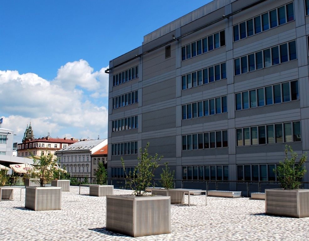 Za rohem, kde se zformoval městský bulvár, je křídlo pravoúhlé, klidné, zdůrazňuje dolní obchodní patra. Za malou mezerou, která je využita k průchodu na terasu ve dvoře, pokračuje další budova, opět zvnějšku klidná sevřená kostka.